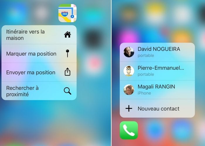 Sur le papier, elle paraît très théorique et fleure même un peu le gadget. Pourtant, une fois que l’on s’habitue à ce nouveau geste, il est presque impossible de s’en passer ! Maintenez votre doigt en contact avec la surface vitrée, l’icône en-dessous se met à vibrer, comme elle le fait depuis longtemps. Mais en appuyant un peu plus fort, on verra s’afficher un petit menu contextuel. Celui-ci donne accès à des actions rapides : appeler un contact directement, lui envoyer un SMS, mener une recherche dans l’App Store, etc. Très pratique.
