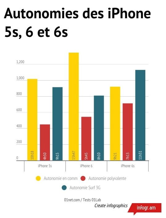 Vient enfin la question de l’autonomie. Les résultats de nos tests sont plutôt positifs. A l’exception d’un raté étonnant en communication. L’iPhone 6s fait moins bien que ses deux aînés dans ce domaine. En revanche, il améliore clairement la donne pour ce qui est du surf en 3G/4G. Plus intéressant encore, il affiche une bien meilleure autonomie polyvalente, obtenue avec une série de tests automatisés assez éprouvants, qui cumulent différents usages (surf, vidéo, jeux, etc.).