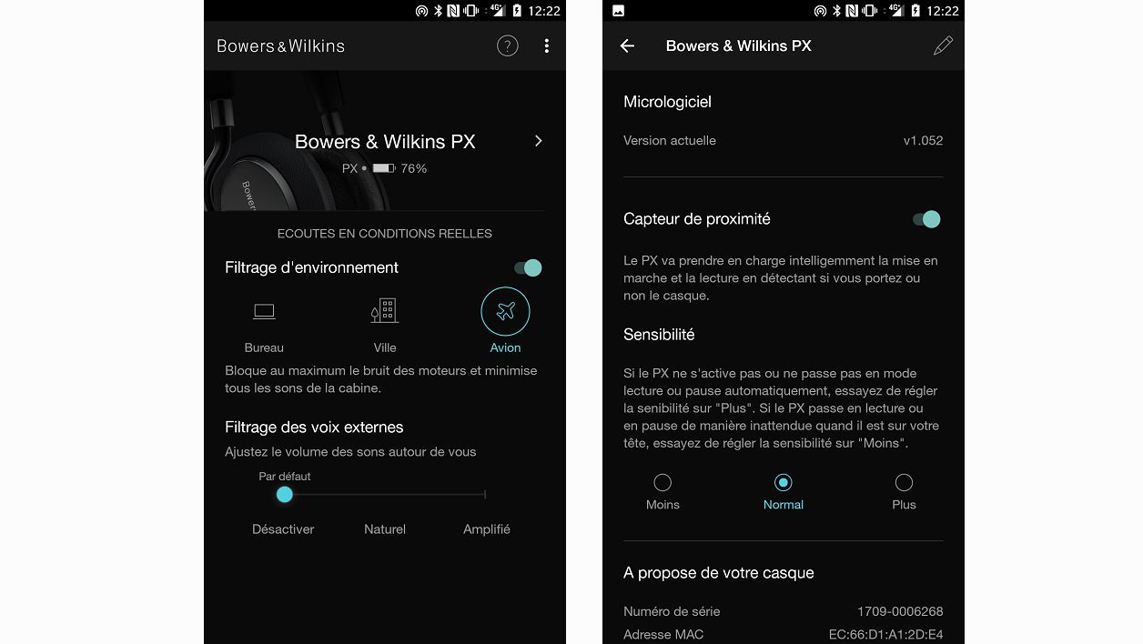 Si notre verdict est mitigé pour ce qui concerne la qualité sonore du PX, sa réduction de bruit s’avère, elle, très efficace. Pour en revenir aux coussinets, on ne peut que regretter qu’ils ne soient pas un peu plus épais pour augmenter l’atténuation passive de l’appareil. Le PX aurait alors pu carrément faire de l’ombre au Bose QC 35 II, comme, en son temps, le Sony MDR-1000X était parvenu à éclipser le premier QC 35. Et ce, d’autant plus que le modèle de Bowers & Wilkins est doté d’une application (Android et iOS) permettant d’affiner cette réduction de bruit pour l’adapter à ses besoins.