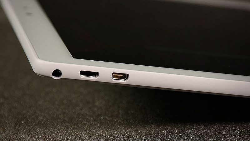 C’est sur le côté gauche qu’on trouve le port micro USB, mais aussi une prise micro HDMI pour brancher la tablette sur un téléviseur, à condition d’acheter le câble adéquat. Notons également qu’en haut de la tablette se situe le lecteur de carte microSD (jusqu’à 64 Go) pour augmenter la capacité de stockage car en l’état, il ne reste que 11,2 Go de disponibles pour l’utilisateur sur les 16 Go embarqués.