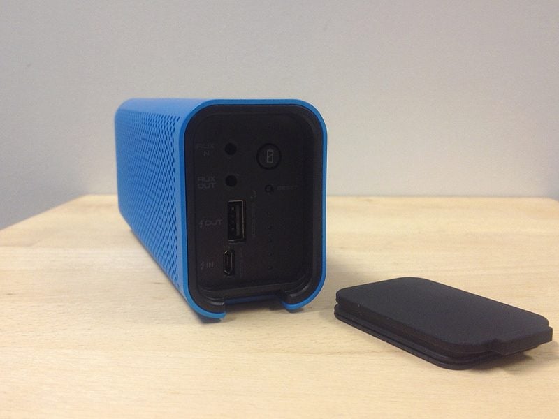 Celle-ci se compose d’une entrée jack, d’une sortie USB pour recharger votre smartphone, d’une entrée miniUSB pour recharger la batterie (câble fourni) et, aussi, d’une sortie auxiliaire. Cette dernière sert à « repiquer » le son de l’enceinte dans un autre appareil, un ampli par exemple.