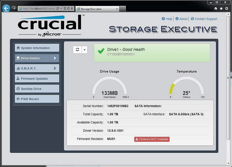 Crucial rejoint enfin les autres constructeurs (Samsung, OCZ, SanDisk) en proposant un programme pour gérer le SSD. Pour le télécharger, il faut aller dans la section support du site Web du constructeur. Le programme Crucial Storage Executive est disponible uniquement pour Windows (versions 32 bits ou 64 bits) et nécessite un navigateur Internet pour son interface. Il indique l’état du, ou des SSD Crucial, et permet de mettre à jour leur firmware. Il offre également une fonction d’effacement sécurisée. Dans ce domaine, Crucial ne fait pas aussi bien que les autres constructeurs, en particulier Samsung et son Magician, mais c’est un bon début.