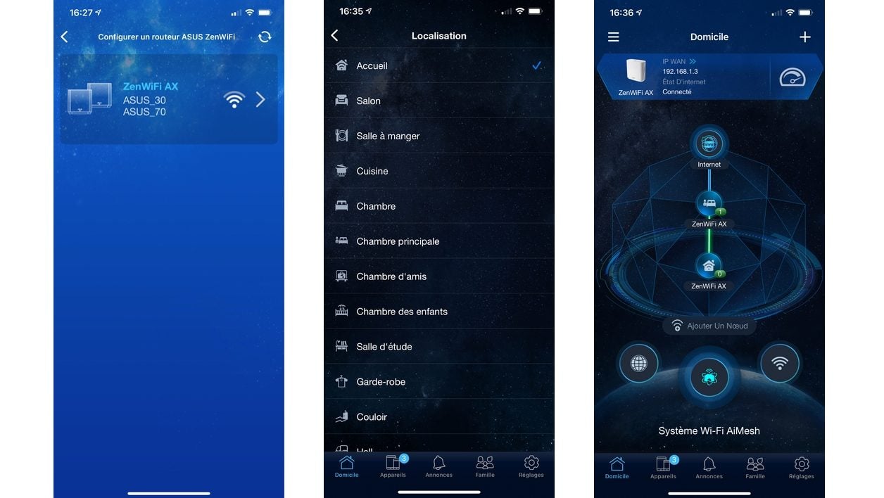 L’installation des ZenWiFi AX, d’Asus, est exemplaire et s’inscrit parfaitement dans les commandements des routeurs maillés qui doivent être simples à mettre en route. En l’occurrence, on les branche au secteur, les place à moins de trois mètres l’un de l’autre et on connecte un câble Ethernet sur le futur routeur principal. On attend quelques dizaines de secondes, puis cherche un réseau Wi-Fi Asus non chiffré sur son smartphone. On se connecte à ce réseau, lance l’application Asus Router, qu’on aura préalablement téléchargée et on n’a plus qu’à suivre quelques étapes rapides.