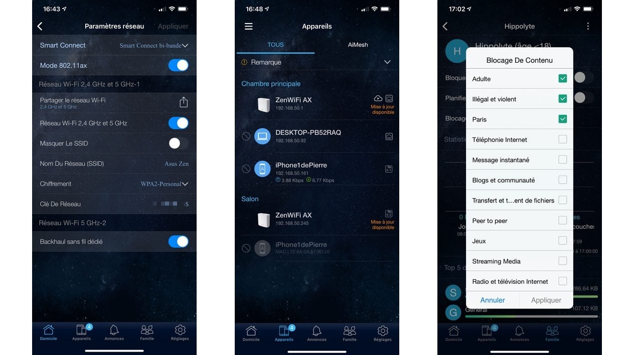 Dans l’onglet Appareils, on trouve tous les éléments du réseau, y compris les routeurs. On peut ainsi voir s’ils sont opérationnels ou, encore, ont besoin d’être mis à jour. Un moyen pratique d’avoir tout à l’oeil – et d’éventuellement établir une liste noire, qui interdira l’accès de certains appareils à votre réseau.
