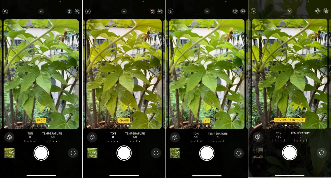 Mais Apple introduit aussi et surtout deux grosses nouveautés. La première est destinée à donner plus de caractères à vos photos, il s’agit de Styles photographiques. Autrement dit un traitement numérique préétabli pour les clichés que vous allez prendre. Vous avez ainsi le choix entre Standard, Contraste intense, Vif, Chaud, et Froid. Ce style sera alors appliqué à chaque fois que vous prendrez une photo. Via un nouveau raccourci dans l’interface de contrôle de l’appareil photo, vous pouvez également rapidement basculer d’un mode à un autre, avant la prise de vue. Enfin, il est aussi possible de modifier les deux critères de Ton et Température systématiquement préréglé pour chaque style.
