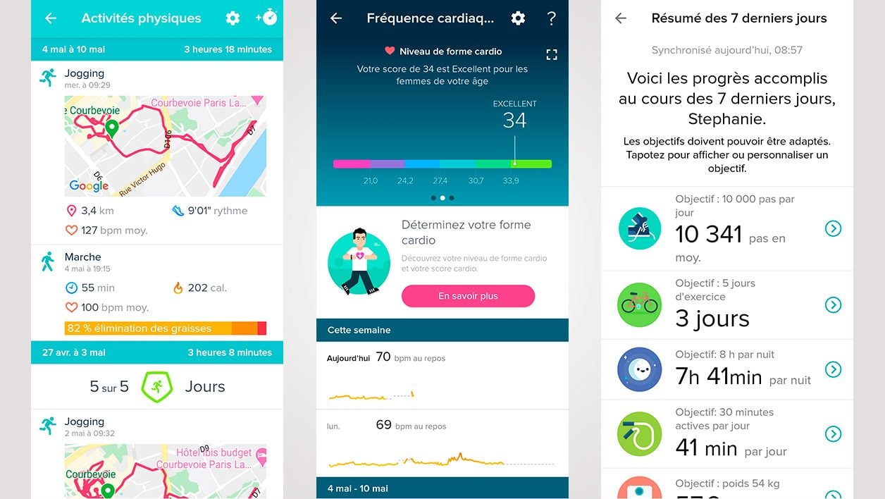 Appli Fitbit : enregistrement d’un parcours grâce au GPS du smartphone, suivi de la fréquence cardiaque et résumé de la semaine.
