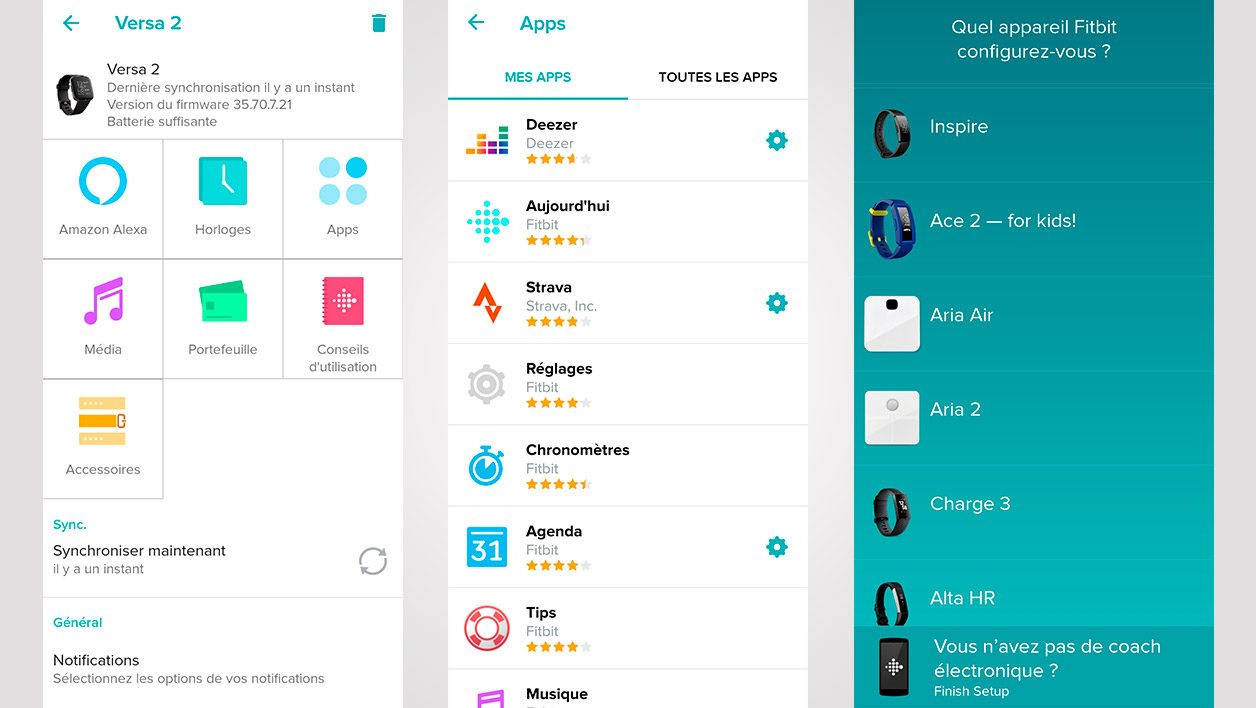 Appli Fitbit : menu général de la montre, galerie d’applications, ajout de produits de la marque