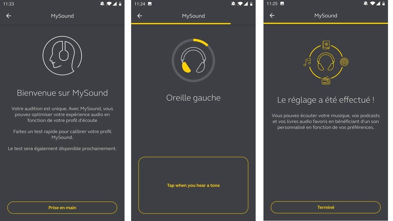 Mais la principale innovation sonore de ces écouteurs est certainement la fonctionnalité MySound qui adapte l’égalisation du casque aux capacités auditives de chaque utilisateur. Pour cela, l’application vous fait d’abord passer un véritable test auditif où l’on doit signaler les bips sonores dès qu’on les entend. Ce procédé permet de déterminer quelles fréquences l’oreille de l’utilisateur discerne le moins bien. On sait par exemple qu’avec l’âge, les fréquences les plus hautes sont de moins en moins bien perçues.