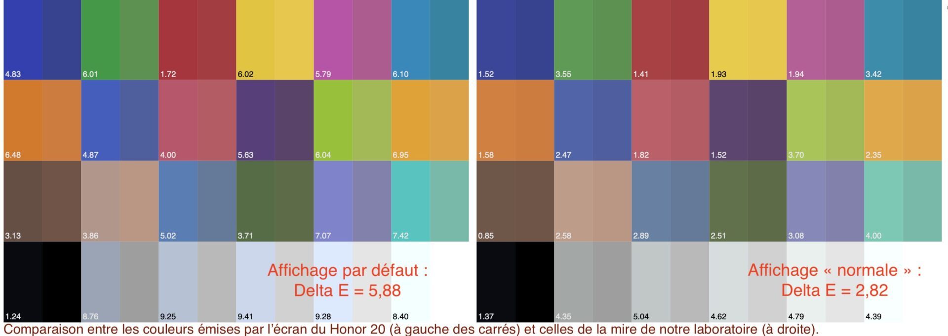 En façade, Honor reste une des rares marques du marché à ne pas se laisser tenter par l’OLED. Le smartphone arbore un écran LCD de 6,26 pouces de bonne qualité, mais qui ne répond pas complètement à nos attentes pour du « haut de gamme ». Selon notre laboratoire, il affiche une luminosité maximale de 527 cd/m2, ce qui est très bien, mais pêche sur d’autres points. Son taux de contraste de 1267:1 n’est pas aussi bon que celui de ses principaux rivaux (qui disposent d’écrans OLED notamment) et la fidélité des couleurs par défaut est vraiment moyenne. Nous avons mesuré un Delta E de 5,88, dû à des tonalités beaucoup trop vives. En optant pour un affichage dit « normales » dans les réglages d’affichage, la justesse des couleurs est sensiblement améliorée… voire excellente (Delta E = 2,82).