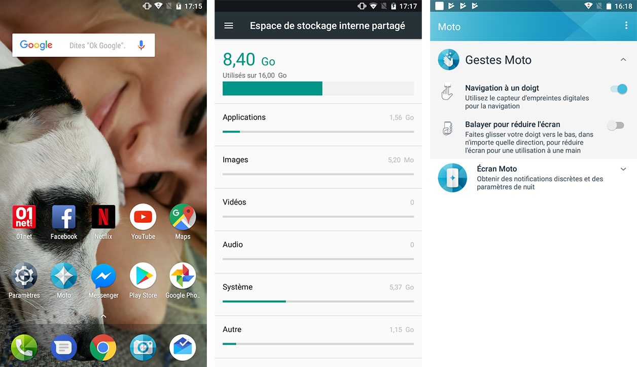 Dans l’ensemble, l’interface logicielle du E4 est strictement identique à une version stock d’Android. Le Material Design est respecté à la lettre et des applications comme Android Messages ou le clavier Gboard sont installées d’office. Dépourvu d’icône dédiée, le tiroir d’applications se déploie en effleurant l’écran d’accueil de bas en haut. Là encore, le raccourci est aussi efficace qu’élémentaire. La configuration très modeste du Moto E4 ne permet pas une fluidité exemplaire. Elle reste très acceptable pour faire le minimum, c’est à dire profiter de Facebook, Snapchat, Twitter et autres. Notons que l’OS et quelques applications ont occupé près de la moitié de l’espace de stockage disponible (8 Go sur 16 Go). La carte microSD pourrait vite se révéler indispensable.
