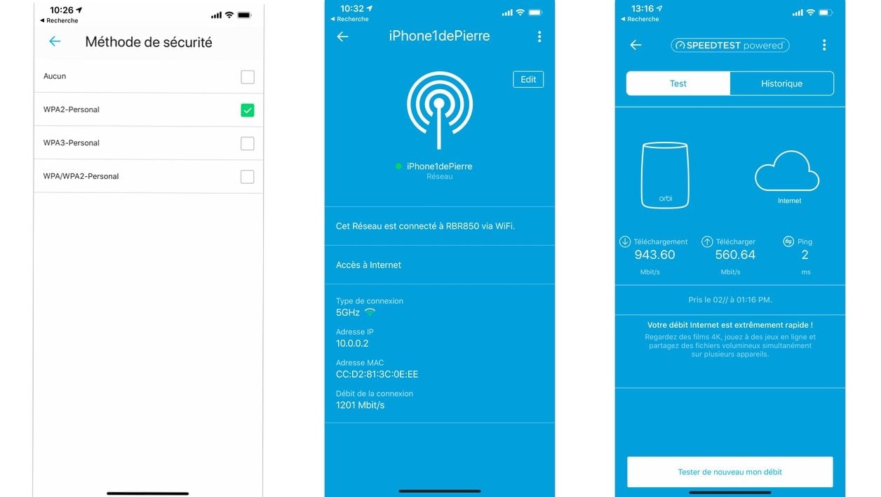 Pour les fans de mesures ou ceux qui veulent s’assurer que tout va bien, l’application Orbi intègre un SpeedTest. Vous pouvez aussi observer quels périphériques sont connectés à quel routeur de votre réseau depuis la rubrique Mappage réseau. Il est aussi possible de paramétrer votre réseau, c’est-à-dire, définir ses SSID et mot de passe, ainsi que sa méthode de sécurité depuis le menu paramètres Wi-Fi. Le WPA3 est évidemment disponible et s’active promptement. Attention toutefois, tous les périphériques ne sont pas compatibles avec cette nouvelle norme de sécurisation de la connexion sans-fil. C’est notamment le cas de la Switch qui ne pouvait pas rejoindre notre réseau chiffré en WPA3 lors de nos tests.