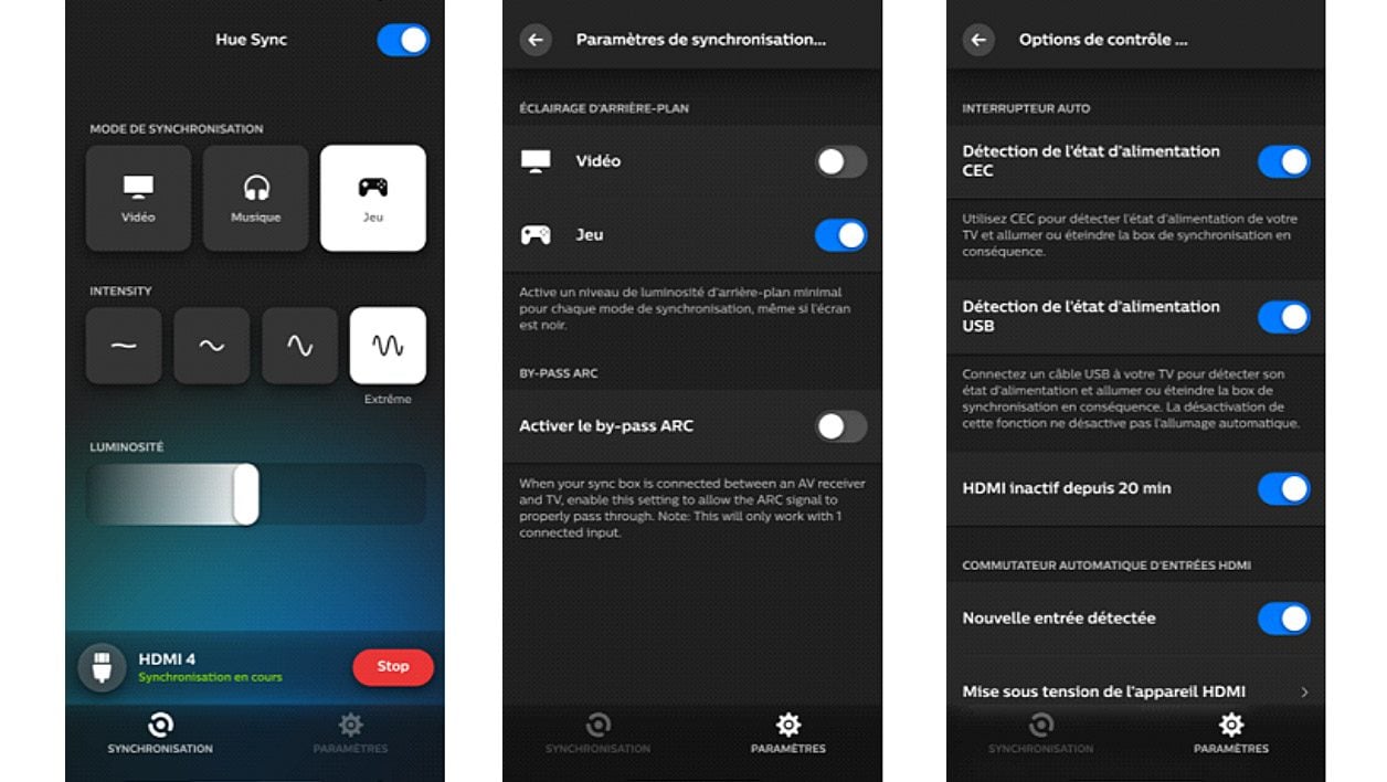 Pour autant, Hue Sync vous permettra d’une part de paramétrer votre installation en décrivant précisément la position de chaque lampe mais aussi de régler l’intensité du signal lumineux, sa fréquence ou encore le type de synchronisation souhaité (vidéo, musique, jeu). Nous aurions simplement préféré que ces options soient intégrées à l’application originelle.