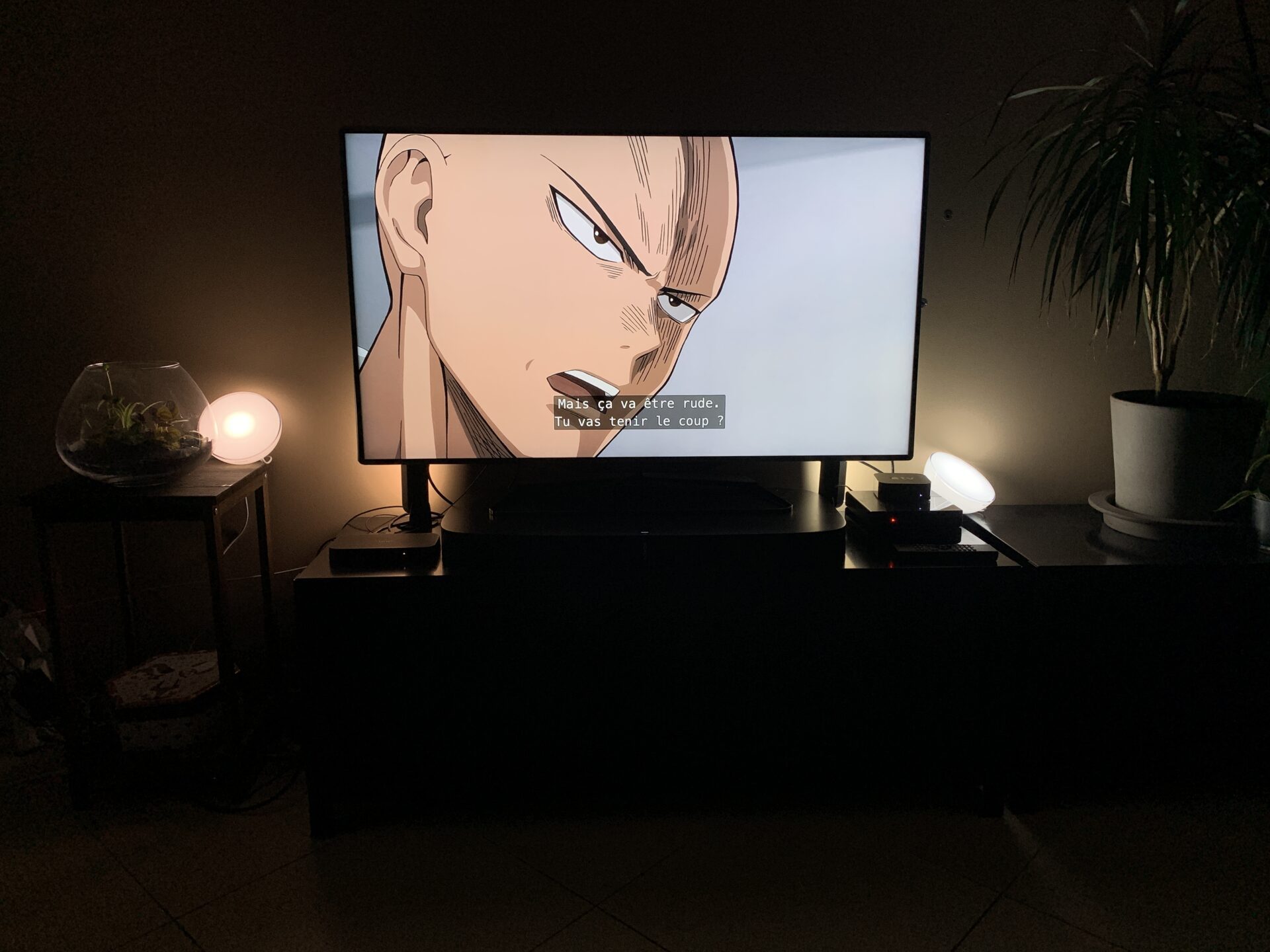 Le premier constat qui est également le principal enseignement du Hue Play HDMI Sync, c’est qu’il fonctionne correctement et qu’il remplit plutôt bien sa mission. La similitude avec l’Ambilight est flagrante et le rendu très proche de ce que peut proposer un « The One » de Philips. Par rapport à un système intégré aux téléviseurs, le boîtier de Signify accuse un très léger retard de quelques millisecondes, à peine perceptible. En revanche, contrairement à l’Ambilight classique qui est limité à la diagonale du téléviseur, l’avantage d’un Hue Play HDMI Sync, est que ce jeu de lumière peut être étendu à toute une pièce. En résumé, un téléviseur Ambilight comme l’OLED854 maîtrisera un peu mieux les effets de lumière mais sur un espace plus réduit.