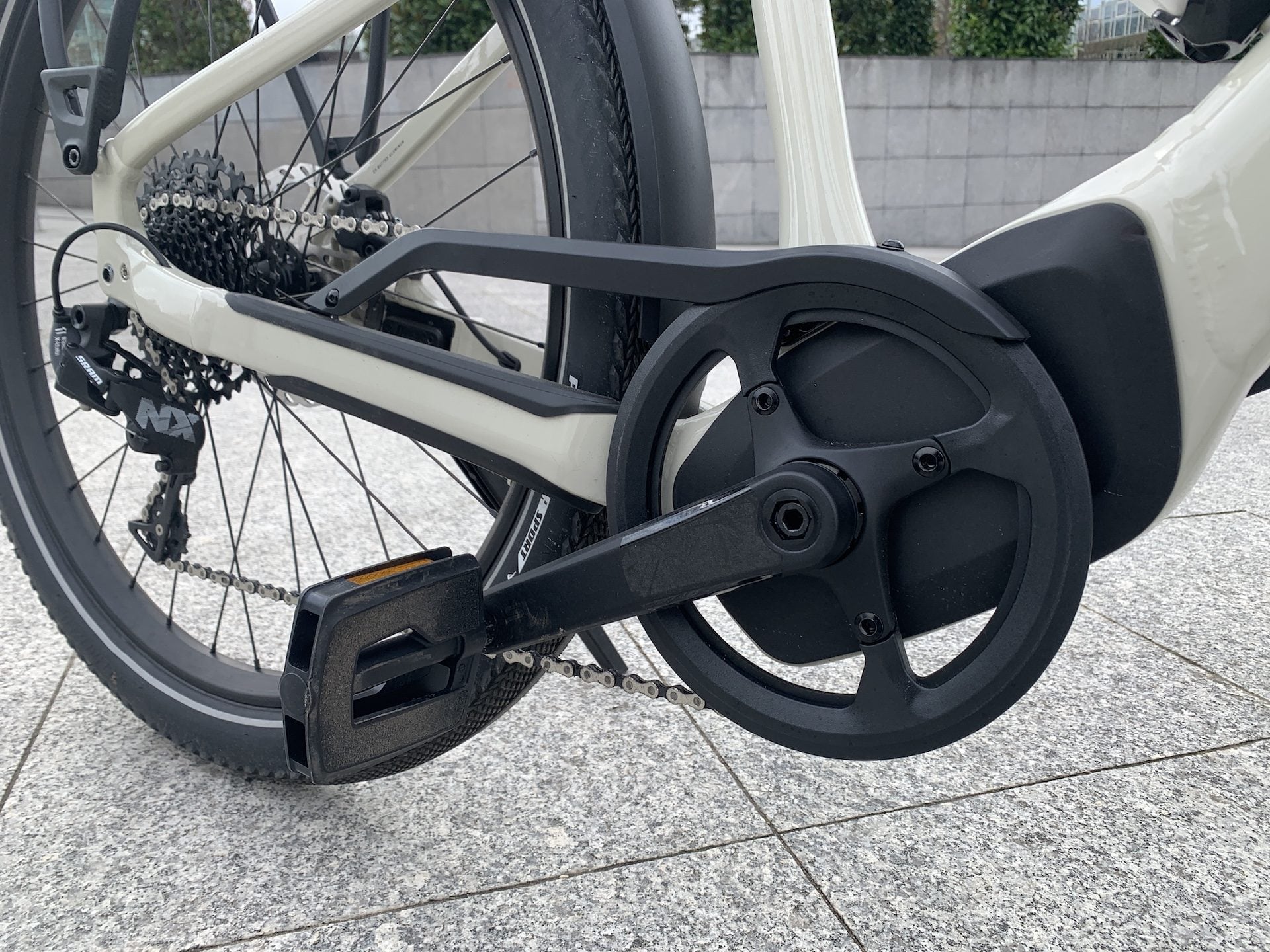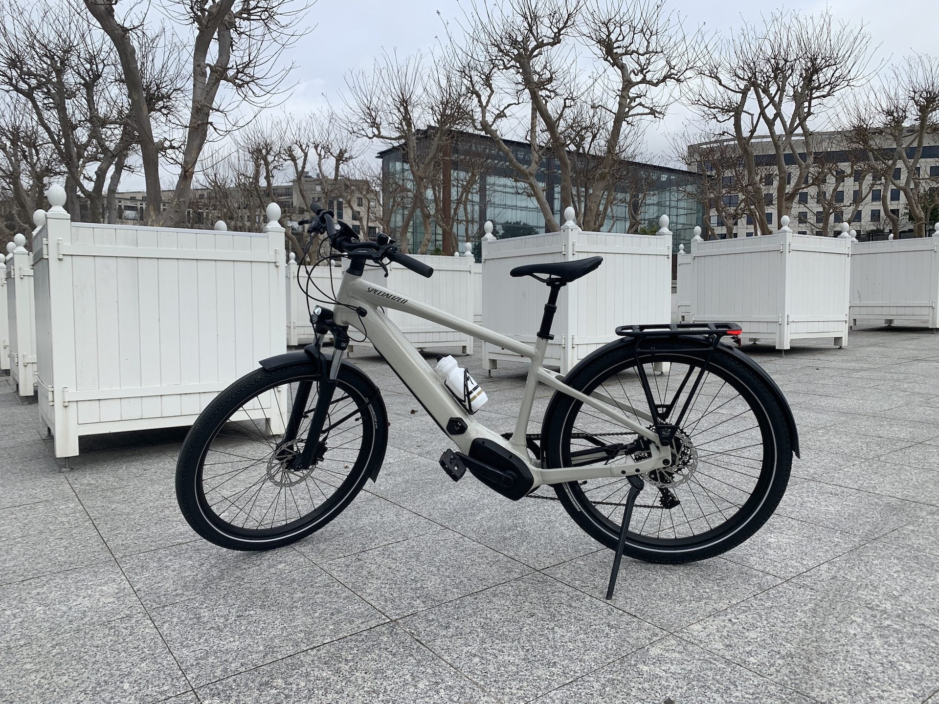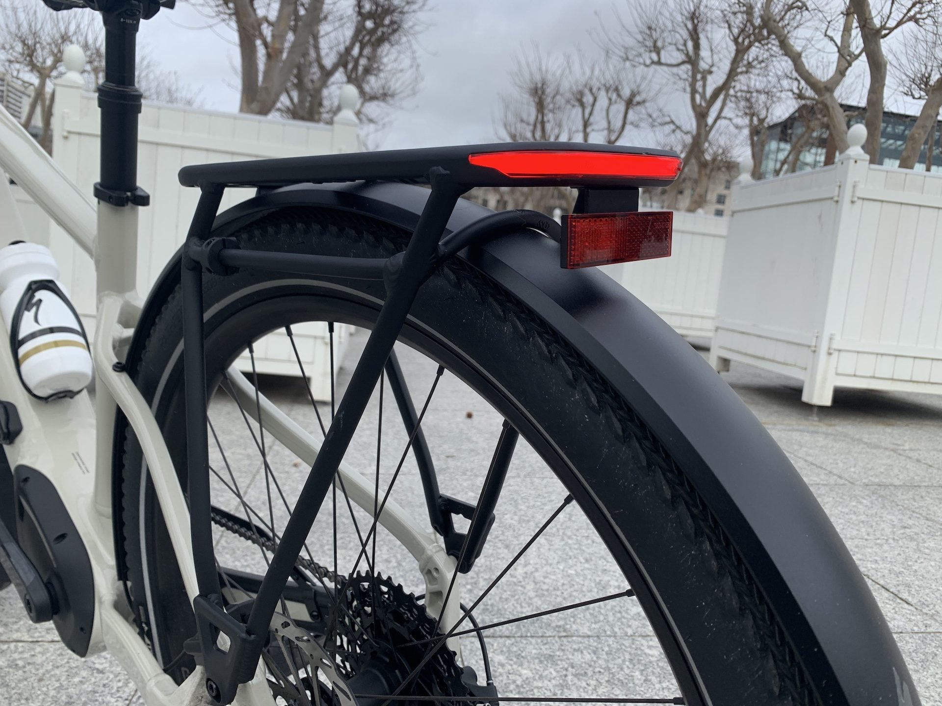 Mais c’est sur les accessoires de confort que Specialized fait le plus fort. Les feux avant et arrière, en plus d’être joliment intégrés sont très performants. La béquille, solide. Les gardes-boues couvrent une grande partie des roues. Quant au porte-bagages, il est compatible avec la norme MIK HD pour une accroche facile des accessoires. En bref, c’est un sans faute sur cet aspect.