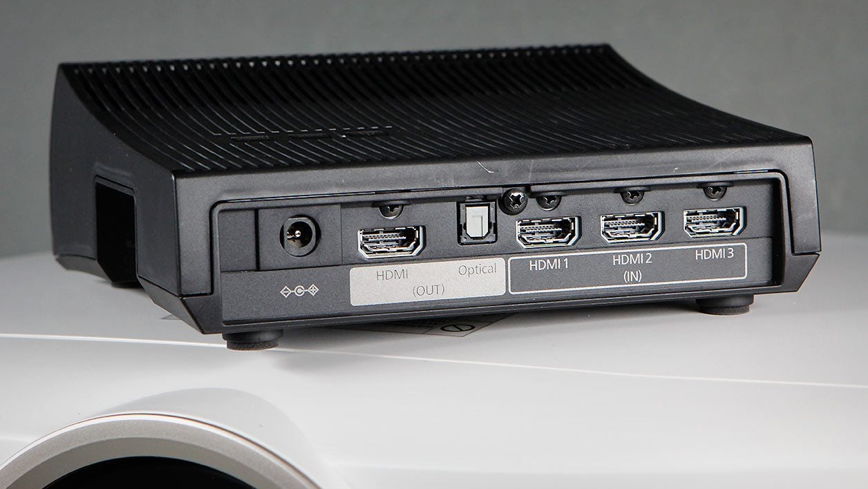 Comme l’indique la lettre W (pour Wireless) en fin de sa référence, l’EH-TW9300W peut fonctionner sans fil, grâce à la technologie WiHD (Wireless HD). Pour cela, il est livré avec un boîtier pouvant accueillir jusqu’à quatre sources. Pour cela, le transmetteur intègre trois ports HDMI à l’arrière et un port sur le côté, ainsi qu’une prise USB pour recharger les lunettes.