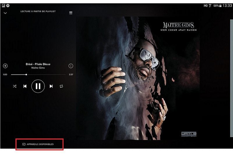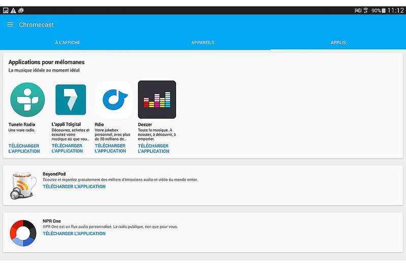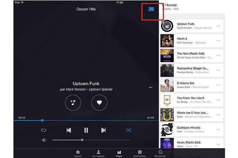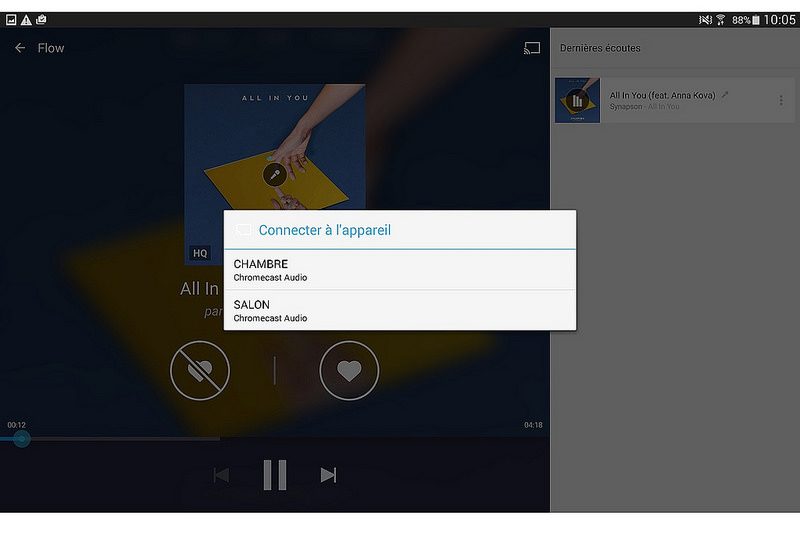 Avec les applications compatibles comme Deezer ou Spotify, l’opération est heureusement plus simple. Lors de la lecture audio, une icône Cast apparait. Il suffit alors de l’activer pour démarrer la diffusion sur le Chromecast Audio. Signalons que la diffusion d’un flux Spotify nécessite un compte Premium.