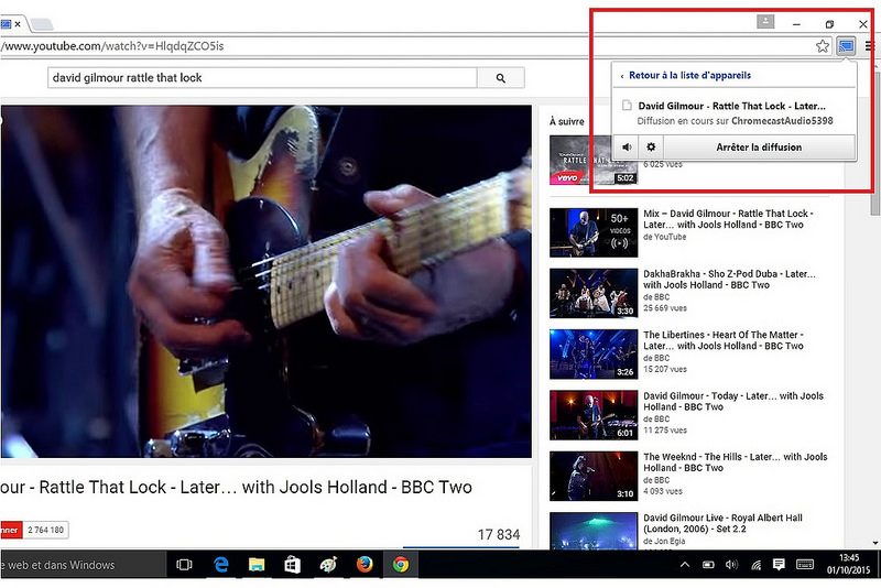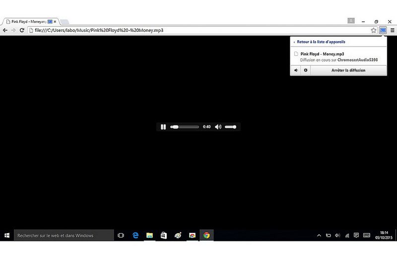 Google a également pensé aux utilisateurs de PC portables, Windows ou Mac OS, mais l’emploi du Chromecast Audio passe alors obligatoirement par le navigateur Chrome. Le site chromecast.com/setup propose de télécharger un programme d’installation qui se charge d’installer le navigateur, s’il n’est pas présent, et l’extension Google Cast.