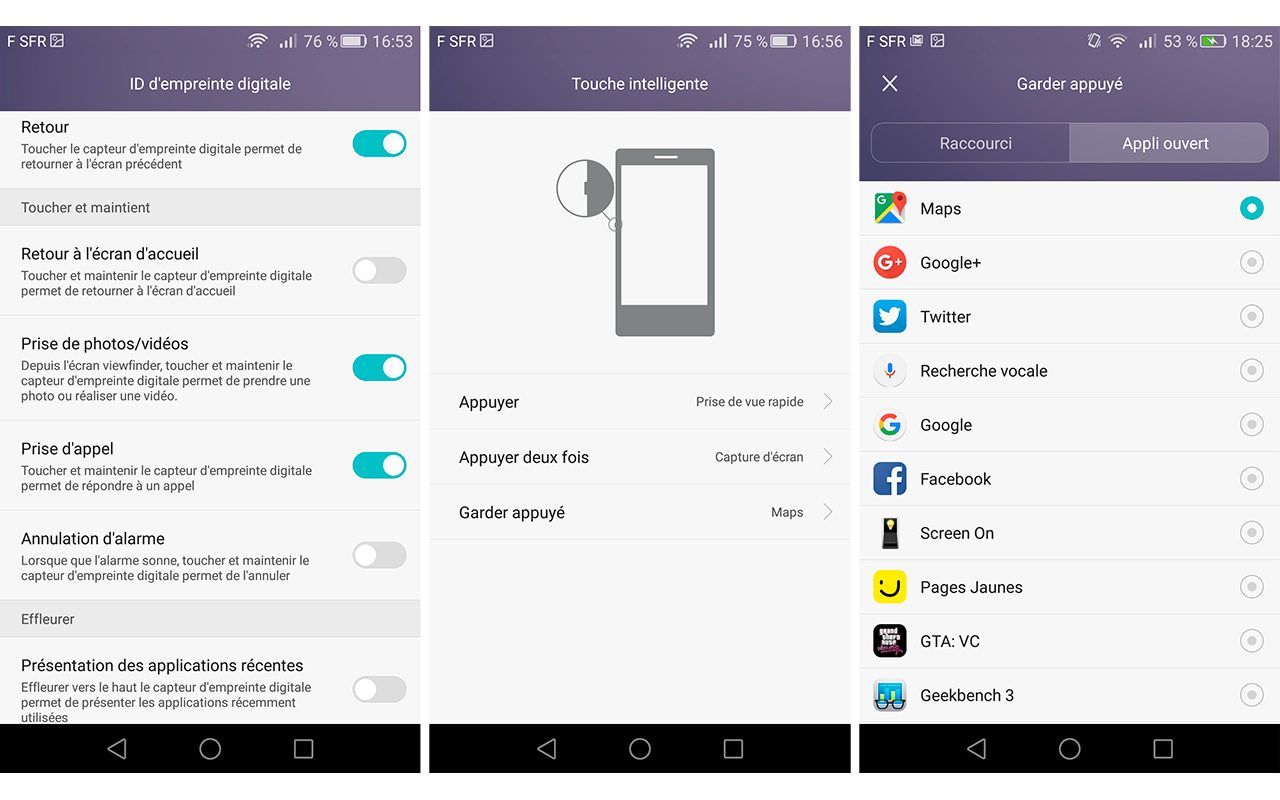 On aime beaucoup plus les fonctions associées à ce capteur d’empreintes (voir notre capture ci-dessous). Par exemple, on peut prendre un appel d’une simple pression longue sur ce capteur. Idem pour le bouton intelligent situé sur la tranche du mobile (à l’opposé du bouton de veille) auquel on peut associer ses fonctions et applis favorites (voir nos captures 2 et 3).