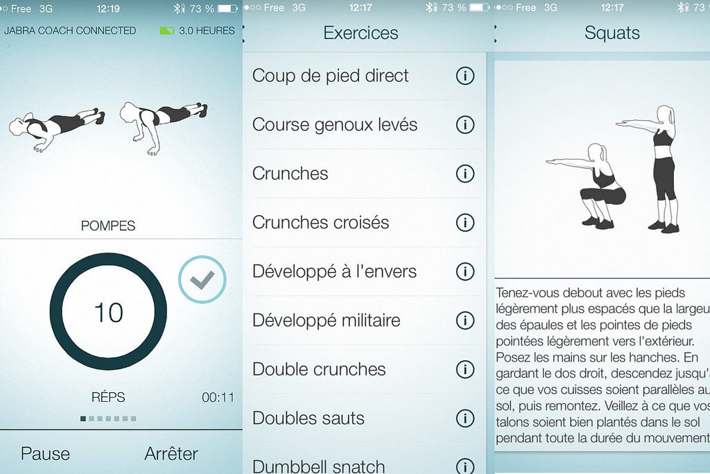 C’est surtout pour le mode « cross training » que le Sport Coach a de l’intérêt. En effet, quelques programmes d’entrainement élaborés par Jabra sont disponibles pour se mettre en jambe. Le vrai gros morceau reste toutefois la composition de son propre programme, avec des exercices variés à choisir dans un catalogue assez fourni. Et si les noms des mouvements n’est pas assez évocateur, Jabra a pensé à les illustrer et, aussi, à fournir des conseils pour les mettre en pratique. Il est possible de s’exercer sur un temps donné ou avec un nombre donné de répétitions : 10 pompes ou 5 minutes de pompes, les deux solutions sont possibles.