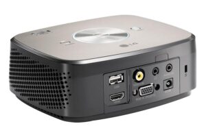 Il est plutôt séduisant ce vidéoprojecteur Emtec. Coque laquée grise sur le dessus, format compact (20,5 x 17,5 x 6 cm), flancs noirs : l’appareil est discret à souhait (1,7 kg). A l’oreille, on apprécie le faible niveau de bruit, aisément couvert par la qualité des haut-parleurs. Nous avons pourtant mesuré un bruit en fonctionnement à 40,1 dB, ce qui devrait être véritablement gênant lors de projections de documents bureautiques.