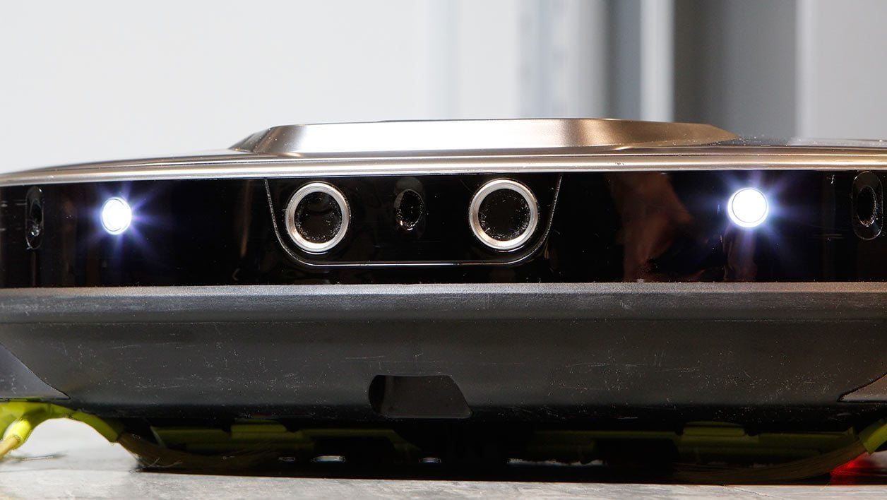 La première caméra, située sur le dessus, est utilisée par l’aspirateur pour mieux se repérer dans la pièce. En plus des capteurs de proximité et de vide (pour détecter, une marche ou un escalier), ce dernier utilise la caméra pour reconnaître au mieux la forme de la pièce, grâce à l’observation du plafond.