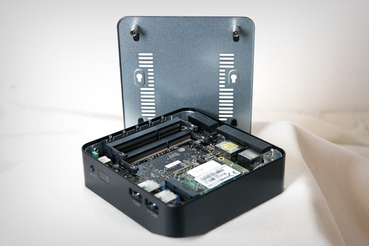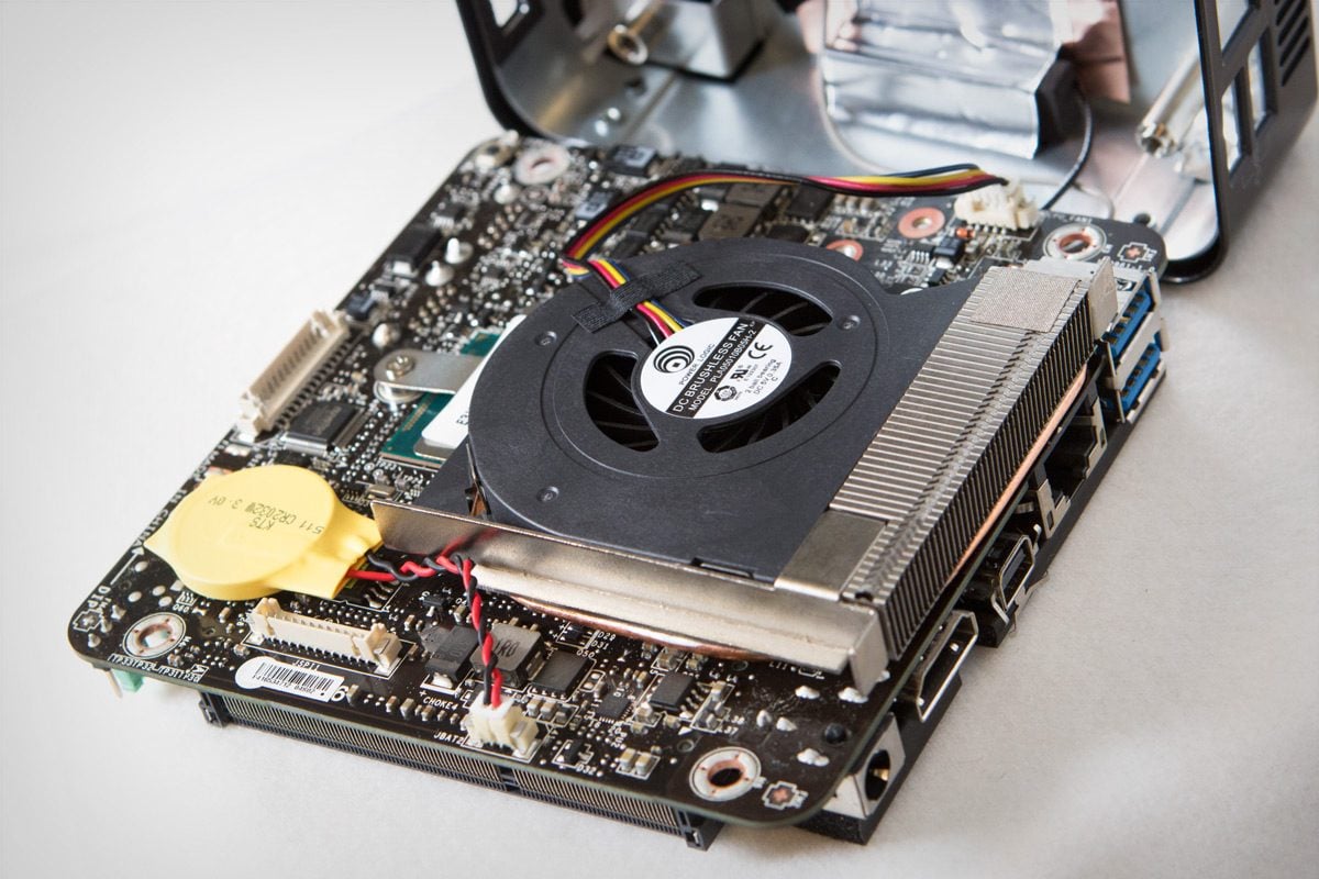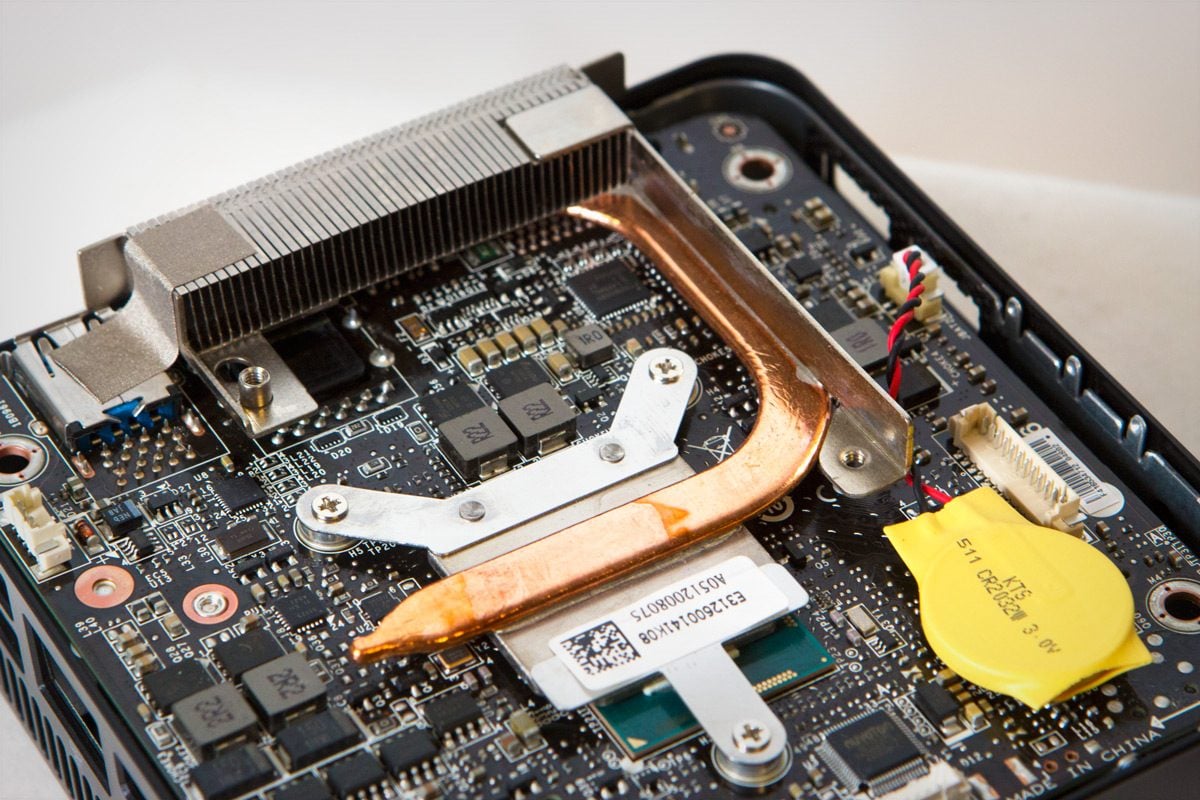 Le véritable avantage de ce mini PC, c’est son silence de fonctionnement : pas plus de 34 dB en charge, ce qui le rend virtuellement inaudible en toute circonstance. Dans ce domaine, ses performances et sa consommation électrique sont très similaires à celles du NUC d’Intel (entre 7 et 31 W). Il est pourtant équipé d’un système de refroidissement légèrement différent, un peu plus compact, mais tout aussi efficace.