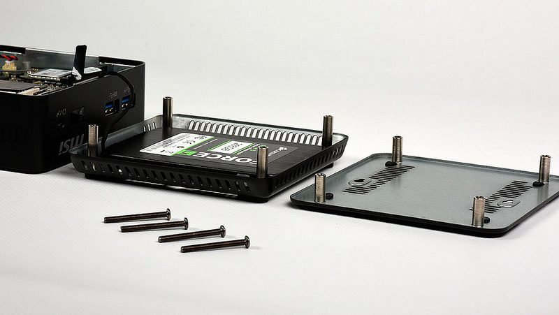 Pour ouvrir le Cubi N, il suffit d’ôter les quatre vis cruciformes placées au dessous du boîtier. MSI livre un fond plat et un fond creux. Ce dernier permet d’installer un disque dur ou un SSD 2,5 pouces mais il augmente la hauteur du boîtier d’environ 1 cm.