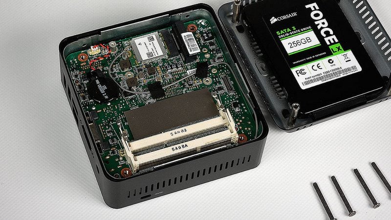 L’intérieur de l’appareil révèle deux emplacements pour de la mémoire SO-DIMM DDR3L avec une capacité maximale de 8 Go. Le Cubi N comporte également un connecteur pour brancher un SSD au format mSATA.