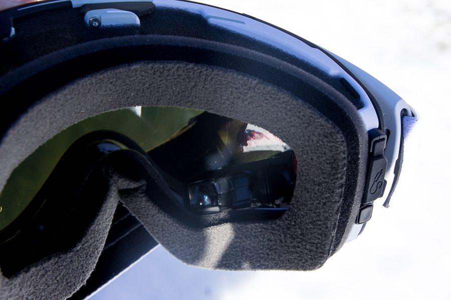 La visière (ou la lentille) d’ailleurs, parlons-en. Sa finition iridium, comprenez les reflets jaune, orange et rouge de la visière, donne un sacré look à ce masque sans pour autant nuire au confort visuel. On pourrait penser que le traitement extérieur de la lentille dénature complètement les couleurs et même assombrisse trop le champ de vision, mais il n’en est rien. Un peu à la manière d’une paire de lunettes de soleil, la vue de l’intérieur est légèrement teintée entre le gris et le vert. Une fois le masque sur le nez, on aime aussi le confort apporté par la mousse qui entoure la partie intérieure du masque. Celle-ci sera particulièrement appréciée des skieurs chevronnés qui passeront toutes leurs journées sur les pistes. Mais le soin porté à l’érgonomie du masque s’arrête là… malheureusement.