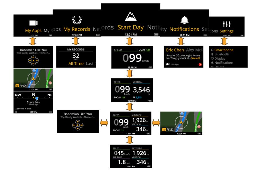 L’ergonomie trop moyenne de ce petit écran est d’autant plus frustrante que lorsque nous sommes en dehors des pistes et que nous prenons le temps de regarder l’écran sans risque de percuter quelqu’un… et bien les menus sont plutôt agréables. Comme il nous est impossible de prendre des photos de l’écran, voici une succession de captures illustrant l’arborescence des menus.