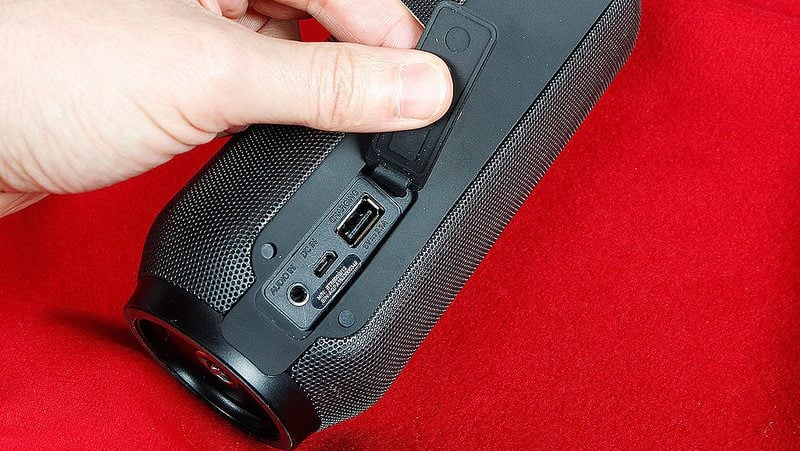 Les connecteurs sont disposés à l’arrière et sont protégés par un cache en caoutchouc. Outre l’entrée audio jack 3,5 mm et la prise micro USB de charge, nous avons apprécié la présence d’un port USB standard pour recharger un smartphone, voire une tablette (5V et intensité suffisante de 2,1 A).