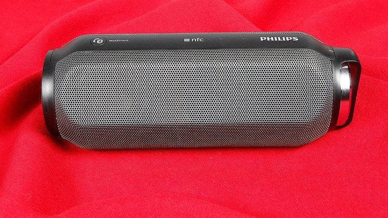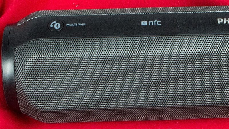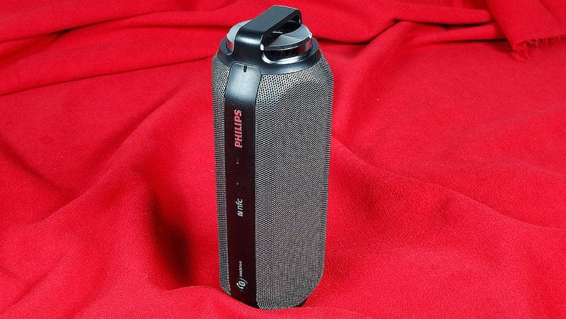 Pour son enceinte, Philips a choisi une forme cylindrique avec un positionnement à l’horizontale ou à la verticale. Nous conseillons plutôt la verticale car cela permet de profiter pleinement du son à 360 degrés et cela offre par ailleurs un meilleur accès au gros bouton de réglage du volume placé sur le dessus.
