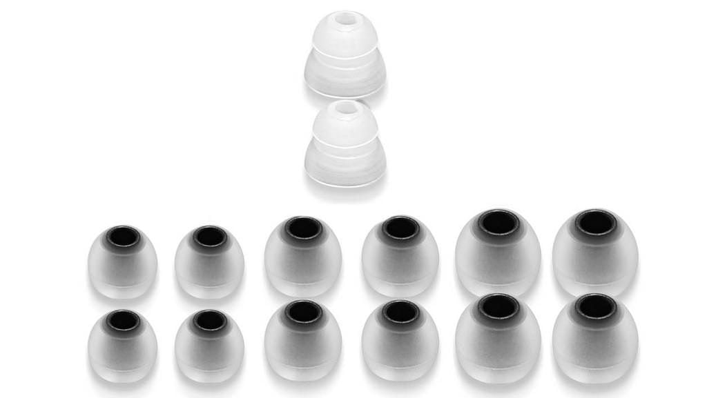 À l’extrémité des écouteurs, il est possible de venir adapter l’un des six jeux d’embouts en silicone qui participent à l’isolation de l’utilisateur comme au bon maintien des écouteurs dans les conduits auditifs.