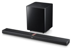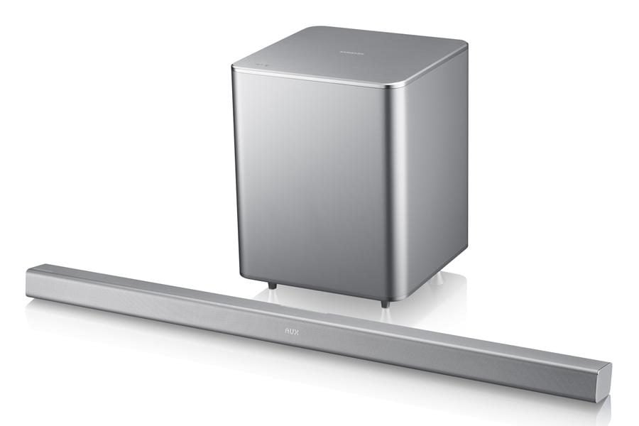 Difficile d’être déçu par cette petite barre de son discrète, fine (6,4 cm de profondeur et 5,5 cm de hauteur) et joliment finie qui constitue un véritable système acoustique 2.1 sans fil. Elle est d’autant plus convaincante que l’amplification numérique (Crystal Amplifier Plus) s’avère relativement musclée, avec 2 x 80 watts pour la stéréo et 150 watts pour le subwoofer.