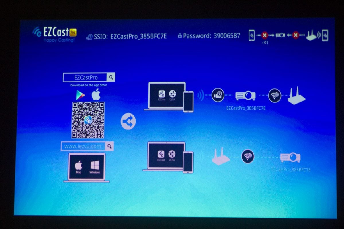 Le Qumi Q6 fait mieux encore puisqu’il intègre une connexion Wi-Fi compatible avec les fonctions AirPlay ET Miracast. Pour cela, le vidéoprojecteur génère son propre réseau sans-fil, protégé par un mot de passe, auquel il suffit de connecter un mobile ou une tablette Android ou iOS. Ensuite, il suffit d’utiliser la fonction Miracast ou AirPlay de l’appareil pour en dupliquer l’affichage. Pour plus de confort, nous recommandons de télécharger l’application gratuite EZCast Pro de Vivitek.