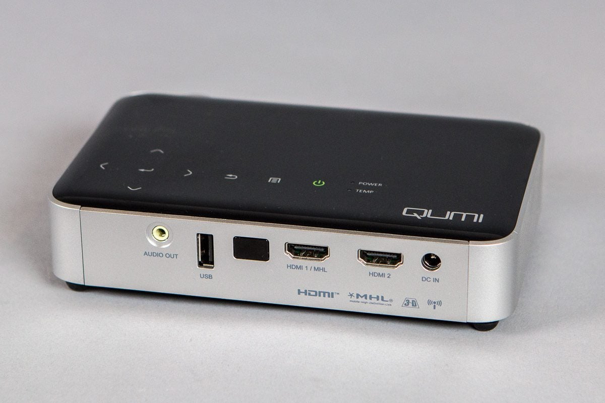 Pour ce Qumi Q6, Vivitek a fait l’impasse sur les interfaces dépassées que sont notamment les entrées Composite et Composante. En revanche, on trouve deux prises HDMI à l’arrière de l’appareil, dont une compatible MHL. Ainsi, si vous disposez d’un smartphone compatible, vous pourrez en projeter l’image via un câble MHL. Le Qumi Q6 est également compatible avec le streaming vidéo Wi-FI, mais nous y reviendrons.