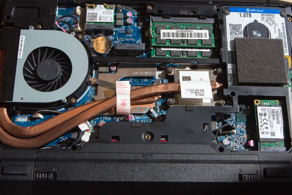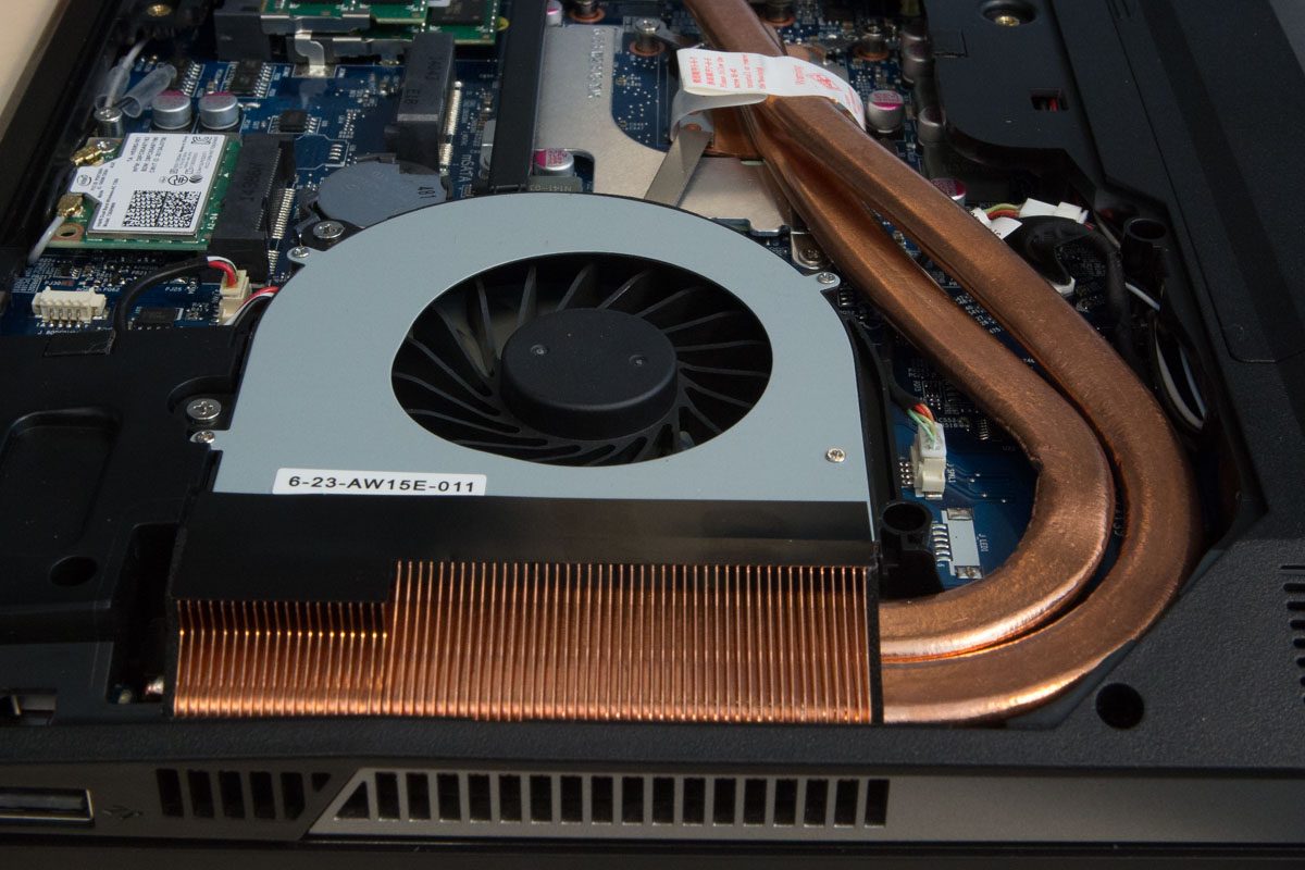 Comme sur tous les châssis Clevo, le démontage est un jeu d’enfant et le nombre de composants accessibles est hallucinant. Nous le mentionnions plus haut, il est possible d’ajouter, changer ou étendre les possibilités de la machine. Mettre les entrailles du A305 à l’air est aussi le meilleur moyen d’étudier le système de ventilation. Sans surprise, il se compose d’un ventilateur et d’un double réseau de tubes de cuivre se terminant par un radiateur, le tout expulsant l’air chaud sur le côté gauche de l’appareil.