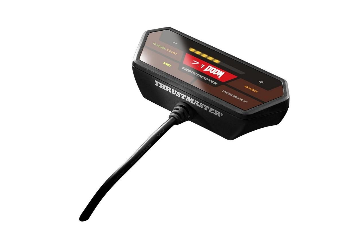 Le Thrustmaster Y-350X 7.1 Powered Doom Edition est, comme son nom l'indique, un casque customisé aux couleurs de la réédition du célèbre jeu de tir à la première personne récemment dépoussiéré par Bethesda. Il est compatible PC et sous licence Xbox One. Son câble peut se terminer par une grosse télécommande à adapter sur la manette de la console de Microsoft. C'est, enfin, le casque le plus cher de la gamme Thrustmaster : 150 euros contre 40 à 100 euros pour les autres modèles.