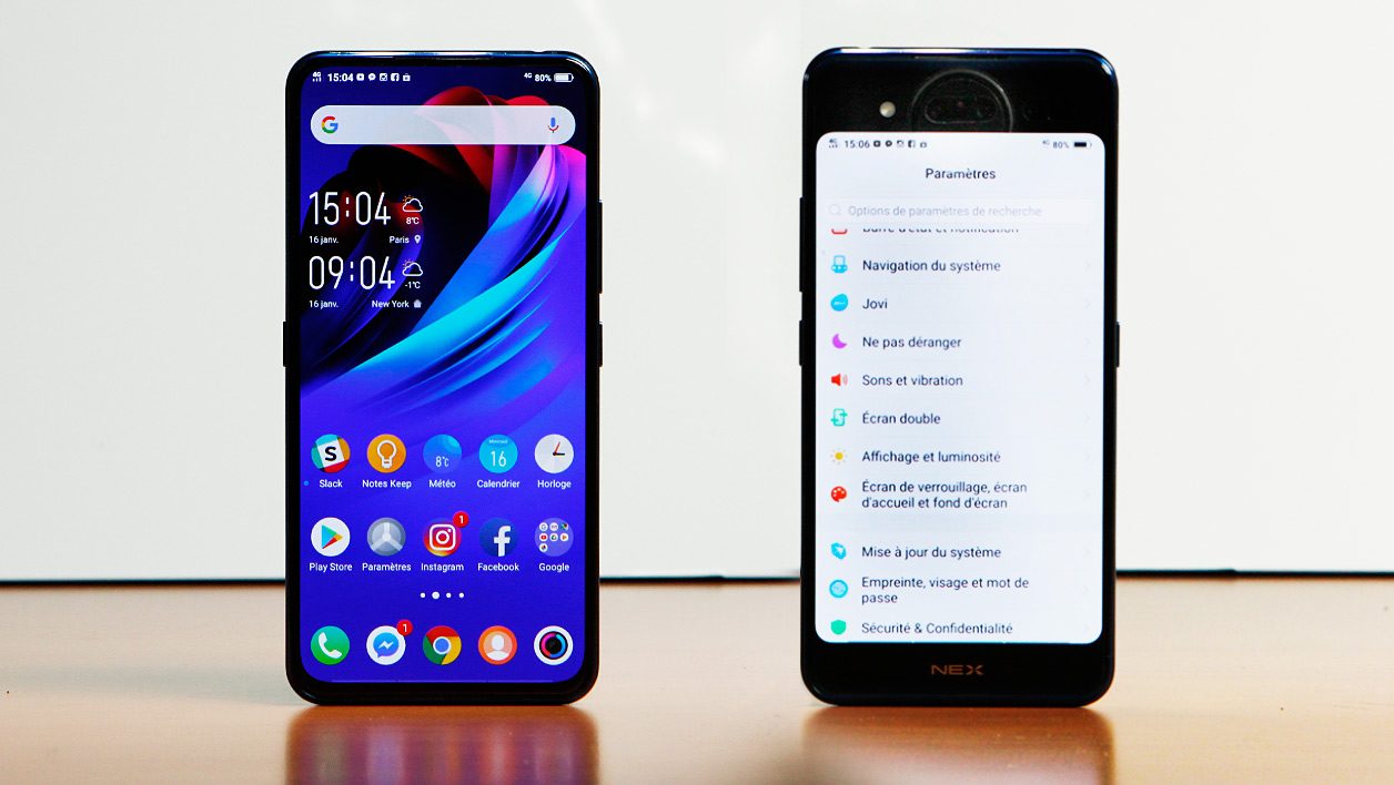 Le Vivo Nex Dual Display est une édition spéciale du smartphone haut de gamme de la marque chinoise. Équipé de deux écrans AMOLED (6,4 pouces à l'avant / 5,5 pouces à l'arrière), il offre une immersion renforcée grâce à l'élimination de la caméra frontale. Pour prendre des selfies, il suffit de retourner l'appareil et d'utiliser la caméra principale de 12 Mpix.